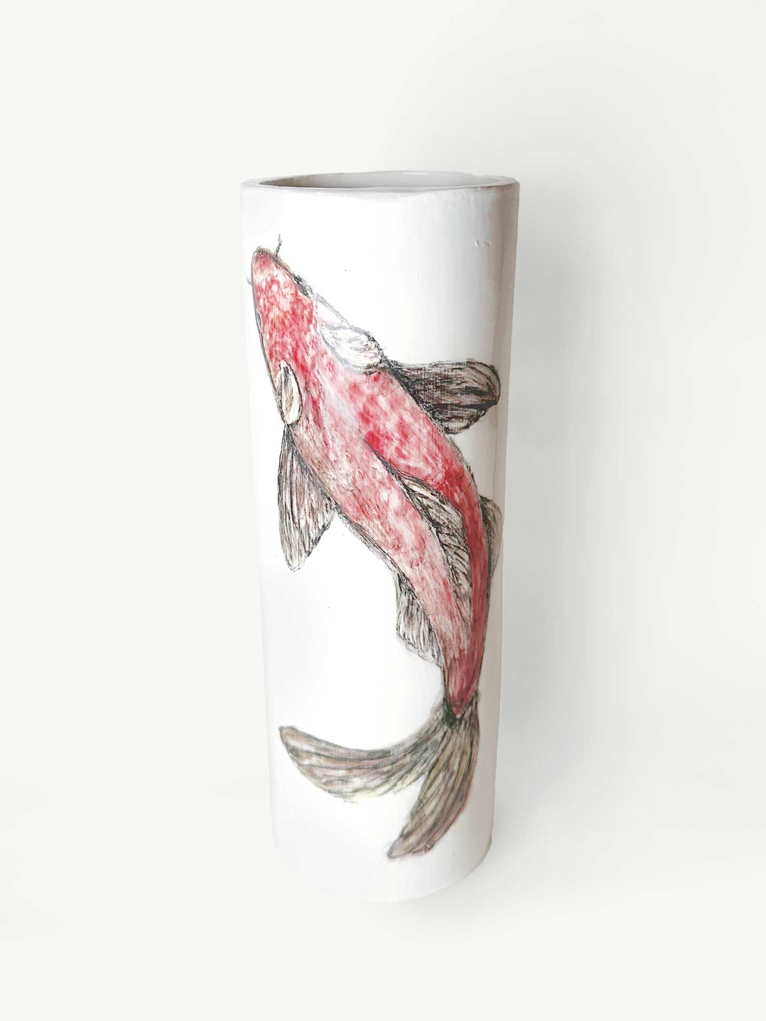 Kory Usage: Flower vase Dimensions: ~ H 24 x D 10 cm Material: Stoneware Glaze: Underglaze engobe white, Transparent Drawing by Mesciu Leo Price: out of stock